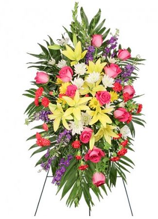 Floral spray arrangements are designed to be viewed only from the front, and will typically be most appropriate as a display during a calling hours or viewing where they can be placed tastefully near the casket or urn.
